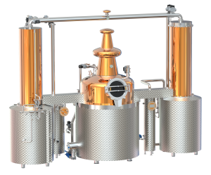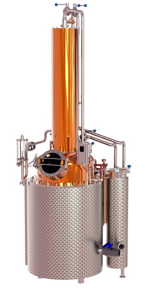 This single unit consists of a pot that is a combination of stainless steel and copper. Mounted on top of the pot is a 2-plate aroma column that holds our patented sieve plate system and a packed section.