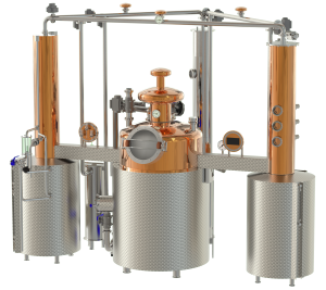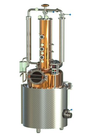 This single unit consists of a pot that is a combination of stainless steel and copper. Mounted on top of the pot is a 2-plate aroma column that holds our patented sieve plate system and a packed section.